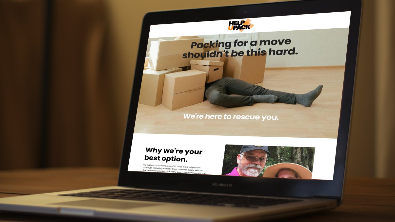 The website centers on empathy and approachability, featuring a hero image of a person overwhelmed by boxes to reflect the stress most people experience during a move. Supporting imagery transitions into lighter, more optimistic scenes, reinforcing HelpUPack’s promise to make packing smoother, calmer, and even enjoyable.