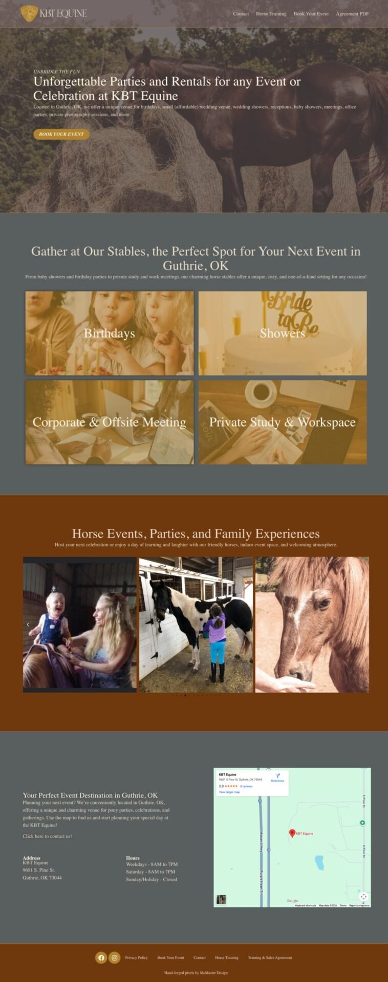 KBT Equine offers horse training, riding lessons, and an event space for private gatherings. While the operation was strong, its brand and website did not reflect the level of professionalism behind the work. The project began with a new website designed to increase reach and drive bookings across lessons, training, and event rentals. An integrated booking system simplified inquiries and improved client experience.